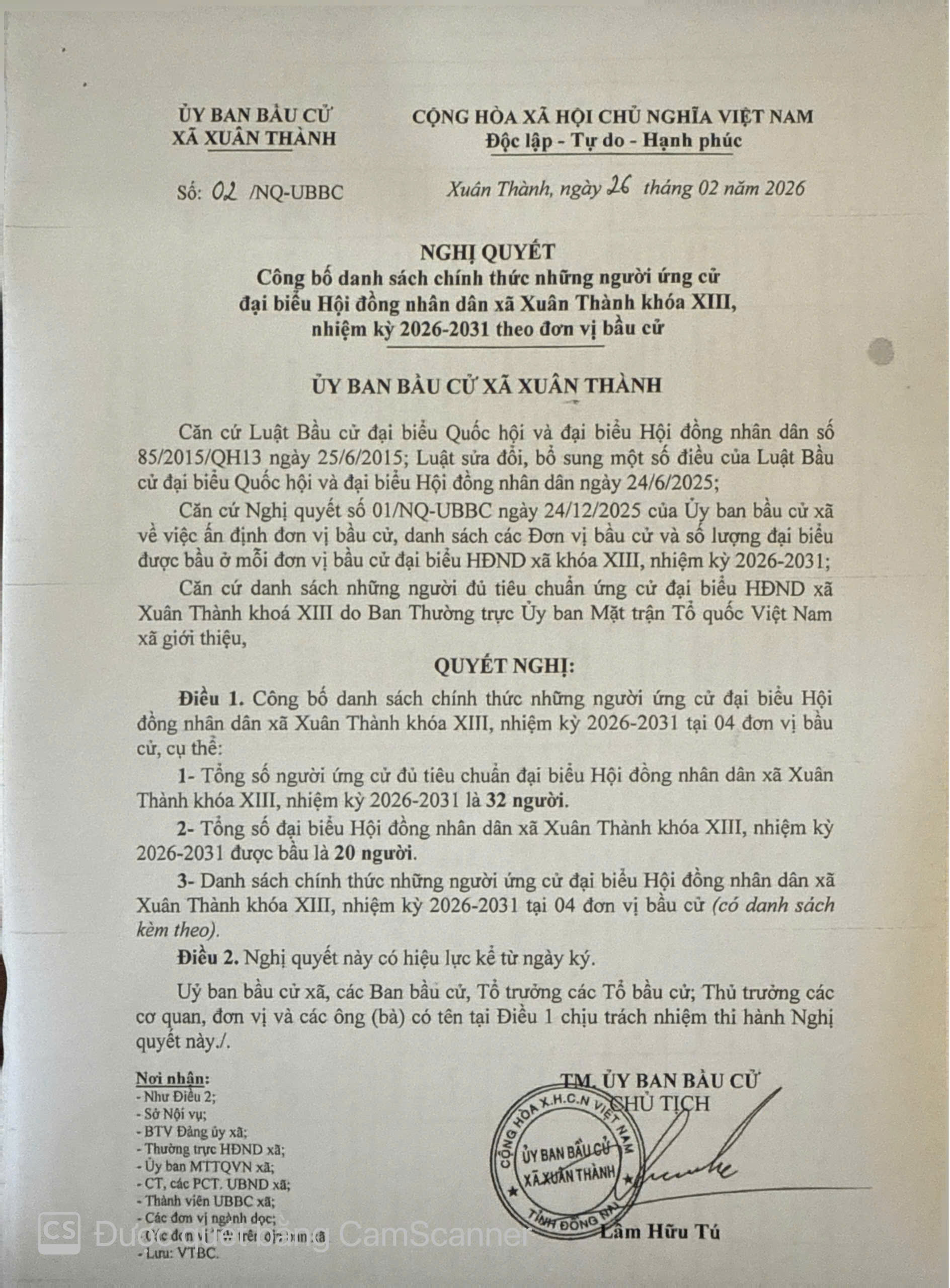 DANH SÁCH CHÍNH THỨC NHỮNG NGƯỜI ỨNG CỬ ĐẠI BIỂU HỘI ĐỒNG NHÂN DÂN XÃ XUÂN THÀNH KHÓA XIII, NHIỆM KỲ 2026-2031